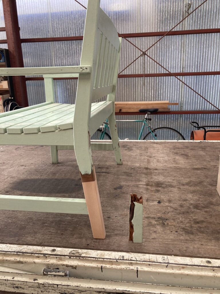 20年前に息子様の誕生祝でアムス工房にて製作させていただいたベンチの脚に腐れがあり、処分も検討されていましたがやはり大切なものなので、と修理をご依頼くださいました。