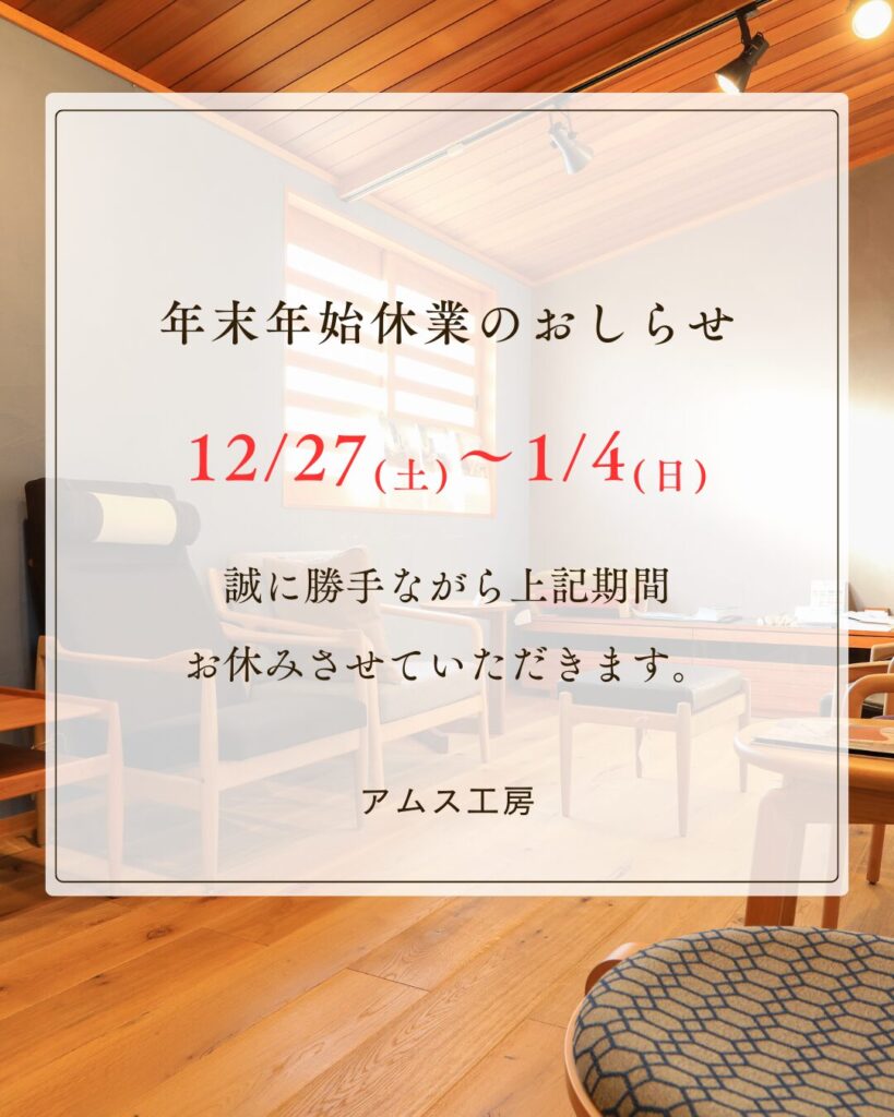 2025.12.23 / 最終更新日時 : 2025.12.23 amskoubou お知らせ 年末年始休業のお知らせ 誠に勝手ながら下記日程を年末年始休業とさせていただきます。2025年12月27日(土) ~ 2026年1月4日(日)2026年1月5日(月)より通常営業いたします。2025年は格別のご愛顧を賜り誠にありがとうございました。2026年もよろしくお願いいたします。アムス工房 スタッフ一同