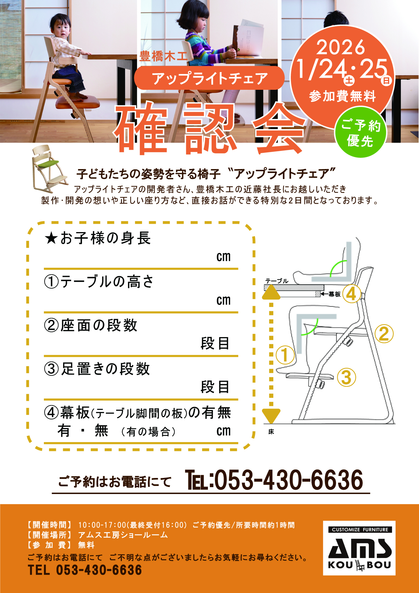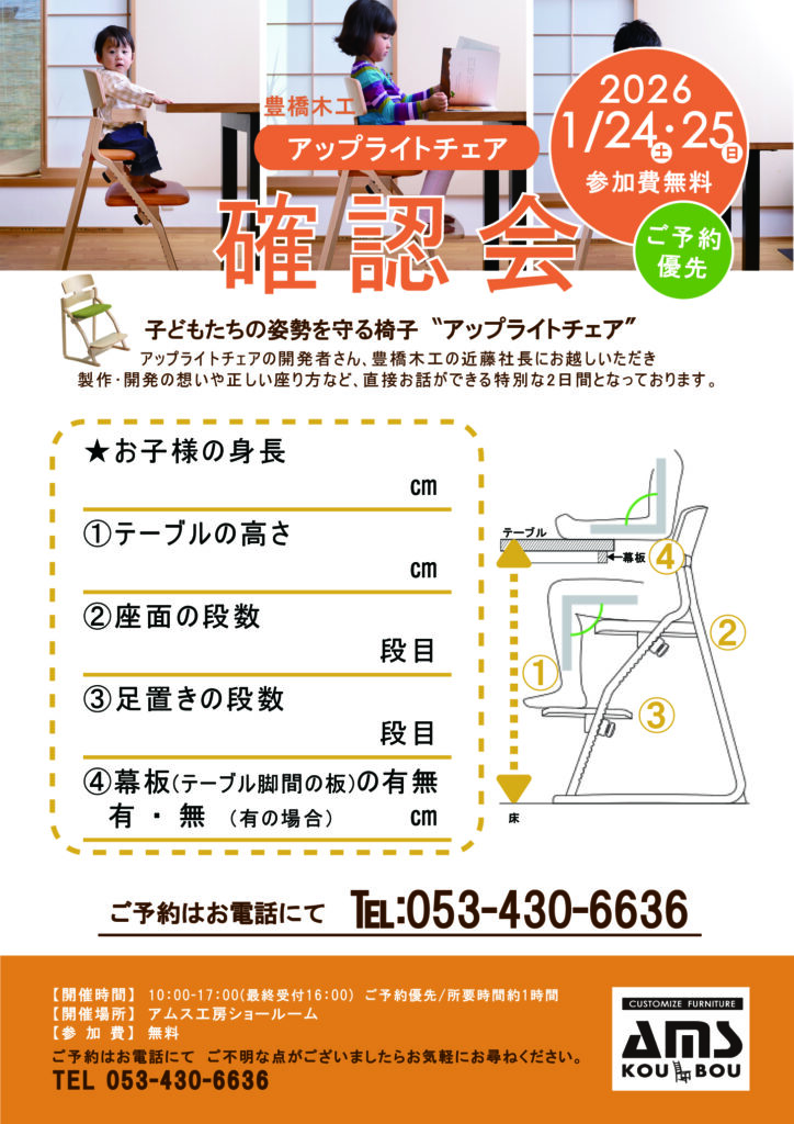 2026.01.05 / 最終更新日時 : 2026.01.26 amskoubou お知らせ 1/24・25アップライトチェア体験・確認会【終了】 子どもたちの姿勢を守る椅子アップライトチェア確認会&体験会を開催します2026年1月24日(土)・25日(日) 好評につき今年も豊橋木工さんご協力のもと体験・確認会を開催いたします!子どもたちの背性を守る椅子『アップライトチェア』アップライトチェアの開発者さん、豊橋木工の近藤社長にお越しいただき、製作・開発の想いや正しい座り方など、直接お話ができる特別な2日間となっております。 「興味はあるけど、具体的にどんな椅子?」 「どうやって使うの?」 「使い方あってるかな?」 「調整の仕方をもう一度教えてほしい!」 姿勢を守る椅子に関してプロであり、真摯に向き合う豊橋木工さんが、お悩み・疑問にとても丁寧にお答えしてくださいます。お子様のためにご購入いただく椅子、ご購入いただいた椅子。買って終わりではなく、末永くお使いいただけるようお手伝いいたします。今年は2月からアップライトチェアの価格改定があるため、少し早めに開催しております。これから購入する方は是非この機会にご参加ください!すでにお使いの方もあっという間に成長するお子様のためにもう一度使い方の確認を一緒にしましょう!皆様のご来店、ご予約お待ちしております。 詳細情報 開催期間2026.1.24(土)~1.25(日)開催時間10:00 – 17:00 開催場所アムス工房静岡県浜松市中央区西丘町259-2お問合せご予約方法tel:053-430-6636お問合せページその他ご予約優先所要時間:約1時間程度 アップライトチェアをこれからご購入の方も、すでにお使いの方もご参加いただけます。 ご予約はお電話もしくはお問い合わせフォームにて↓ご不明な点がございましたらお気軽にお尋ねください。 053-430-6636 10:00-17:00 / 水曜・木曜定休日 問い合わせフォーム